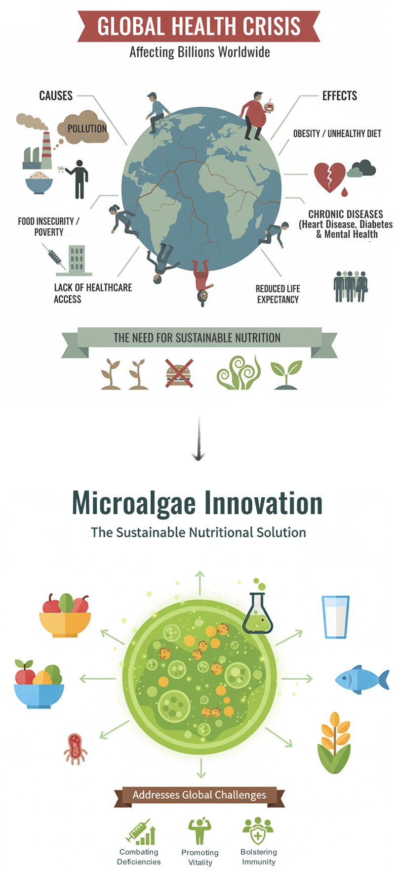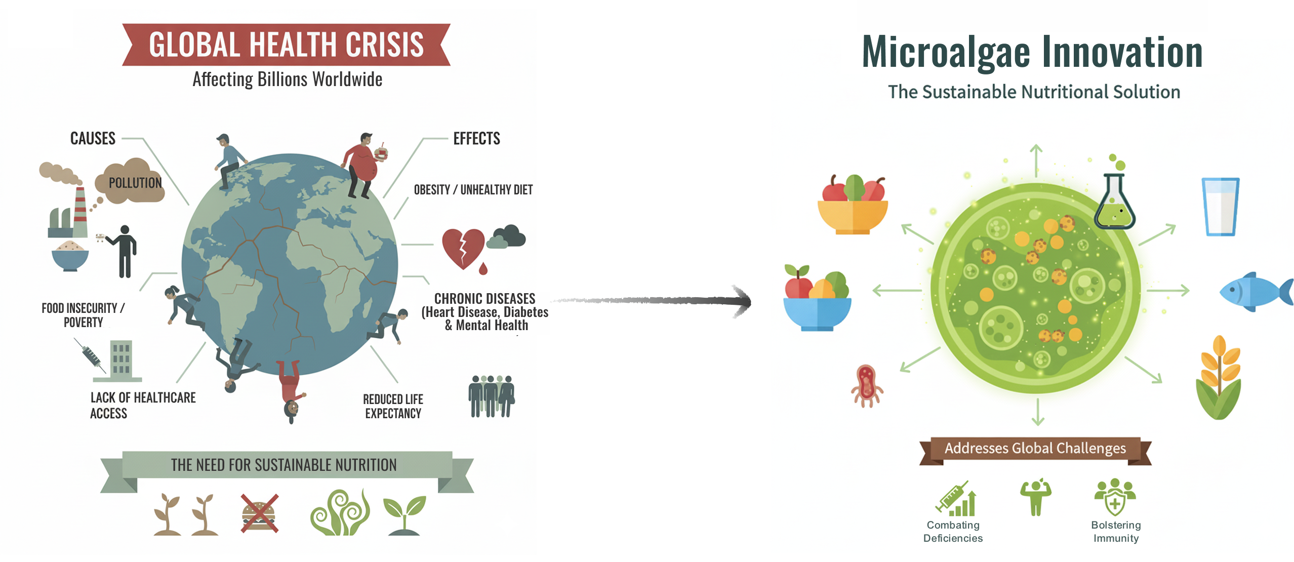 Malnutrition and lifestyle diseases are rising. Most modern diets lack clean, complete, plant-based nutrients. Microalgae offers a sustainable, scientifically proven answer.
