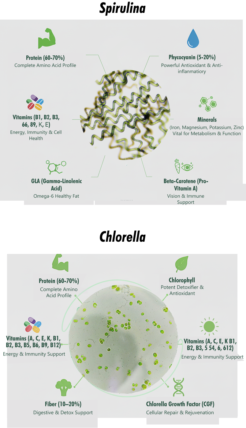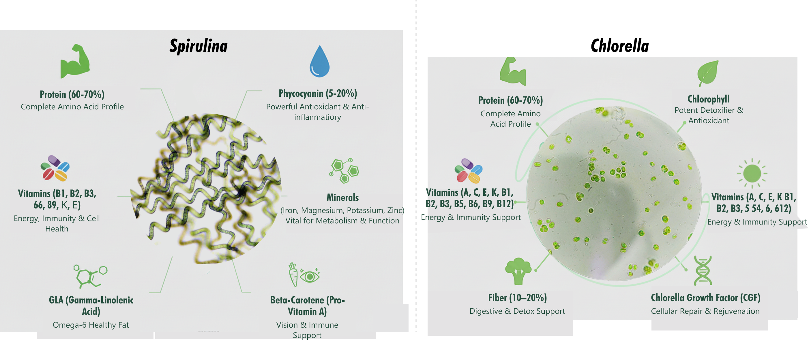Our microalgae are cultivated in advanced, fully monitored environments where temperature, light, aeration, and nutrient balance are precisely optimized for superior growth. This controlled ecosystem ensures Consistent, High-purity Chlorella and Spirulina production year-round—eliminating seasonal fluctuations and minimizing contamination risks. The Result is a reliable, Nutritionally stable Superfood source for every batch we manufacture.